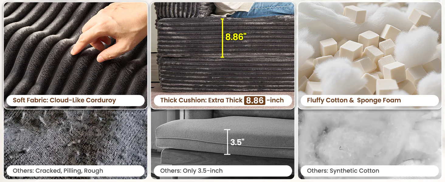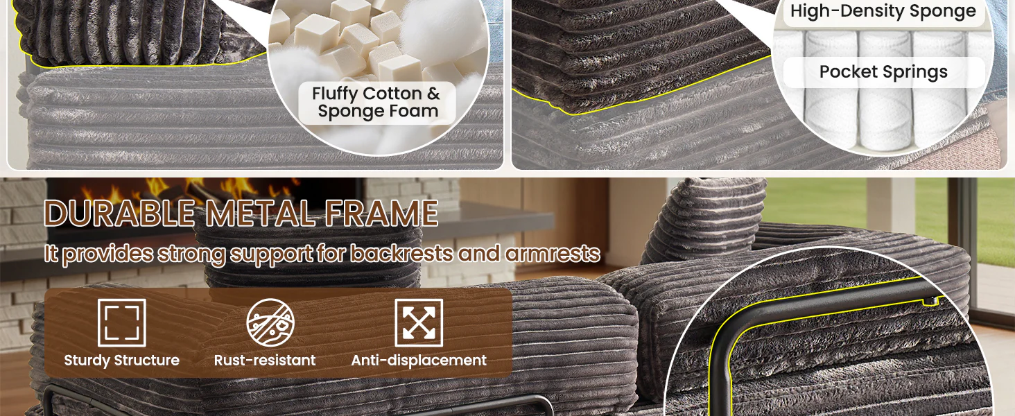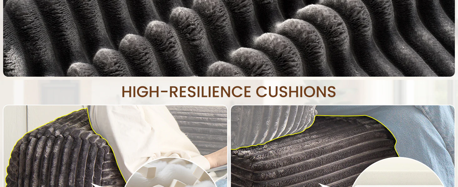 Thick, high-resilience sponge cushions deliver lasting comfort, while the soft yet supportive throw pillows with PP fiber filling bring a refined touch and gentle lumbar support.