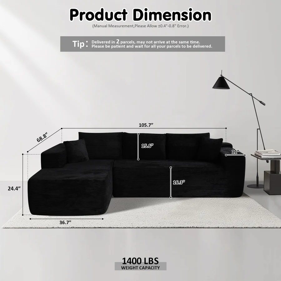 104" L-Shape Modular Couch with Chaise,Corduroy Fabric,No Assembly Required
